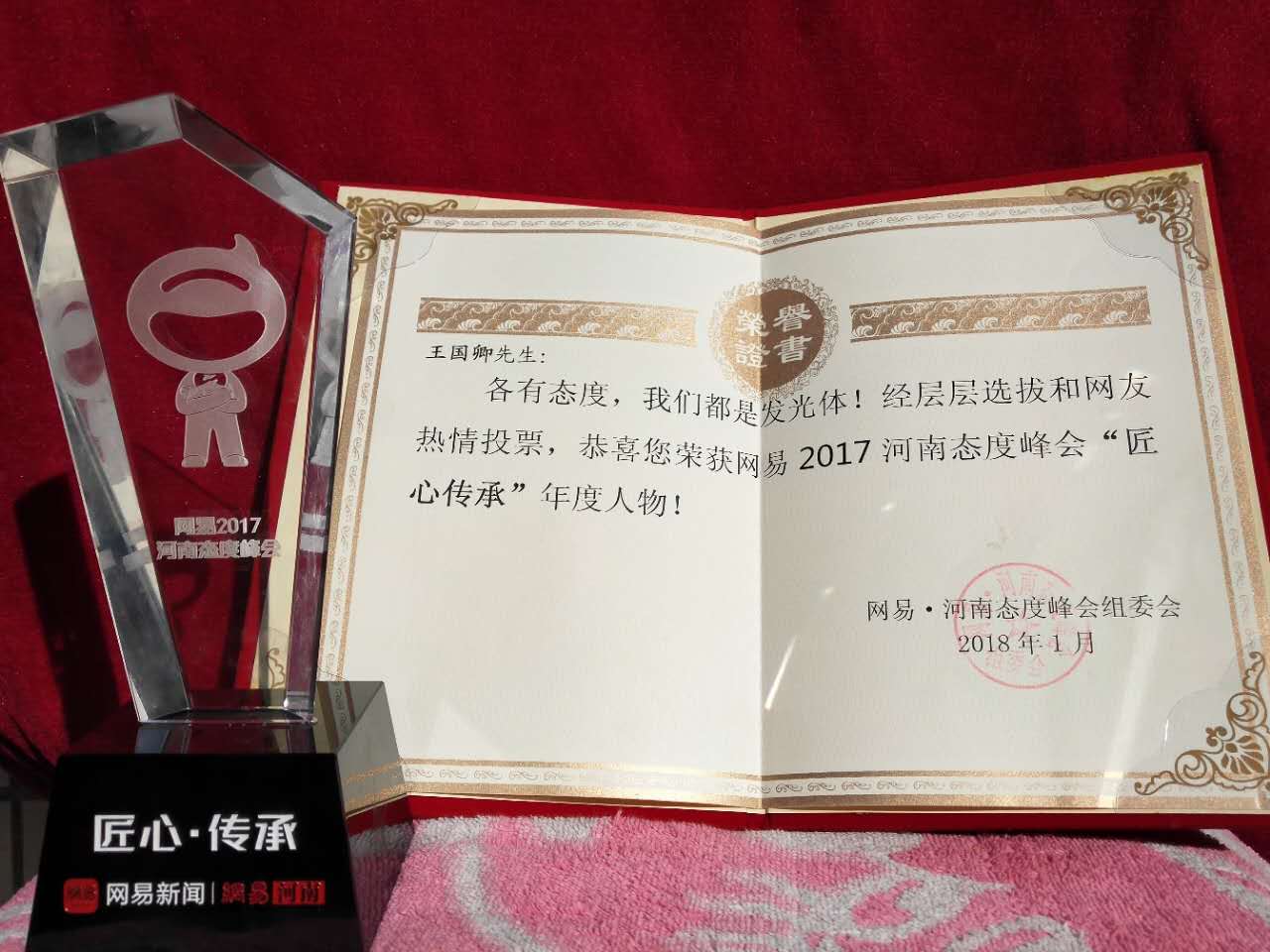 2018年1月9日下午,网易2017-河南态度峰会在大河锦悦酒店震撼开幕。这场盛会聚合了河南各领域和各行业的先锋人物,现场揭晓了“追光者”,“匠心 传承”,“知性时代”等六大态度圈层年度人物。我市非物质文化遗产“超化吹歌”国家级代表性传承人王国卿经层层选拔和网友热情投票,荣获网易2017河南态度峰会“匠心 传承”年度大奖。王国卿发表了获奖感言“我从小的兴趣坚持到现在,吹响管子传承超化吹歌,我们都是发光体,照亮身边更多的人”。