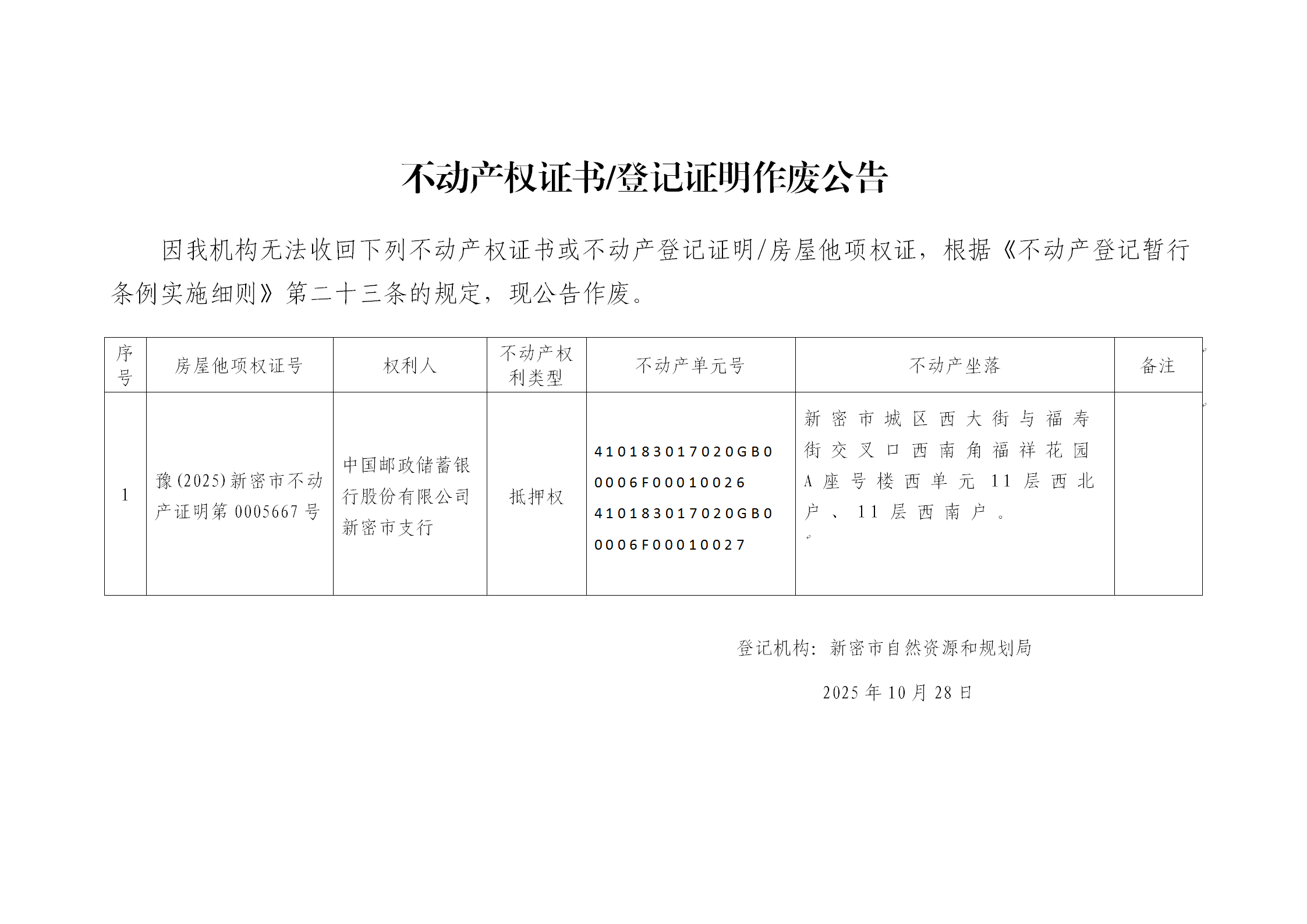 关于豫(2025)新密市不动产证明第0005667号不动产登记证明的作废公告