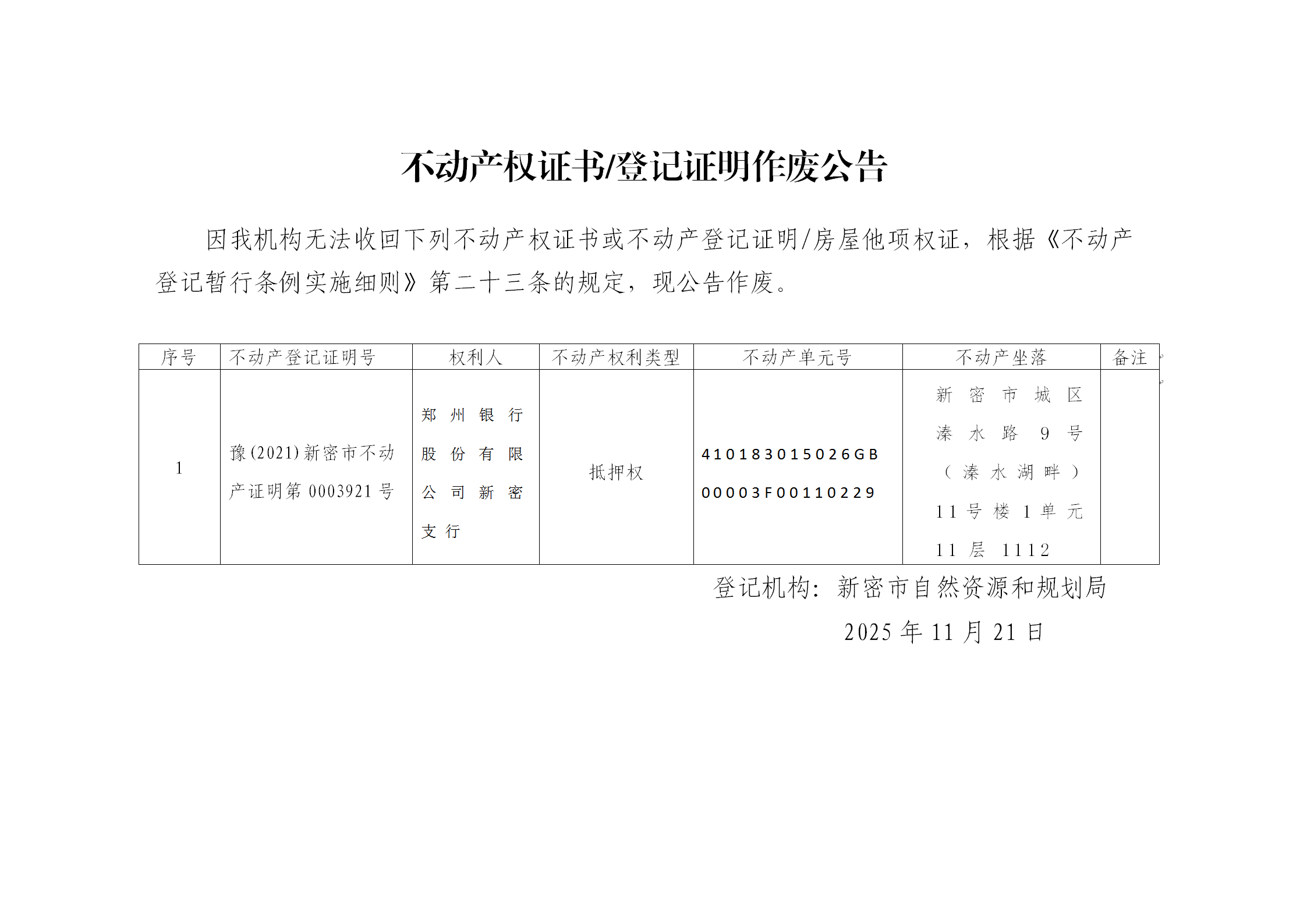 关于豫(2021)新密市不动产证明第0003921号不动产登记证明的作废公告
