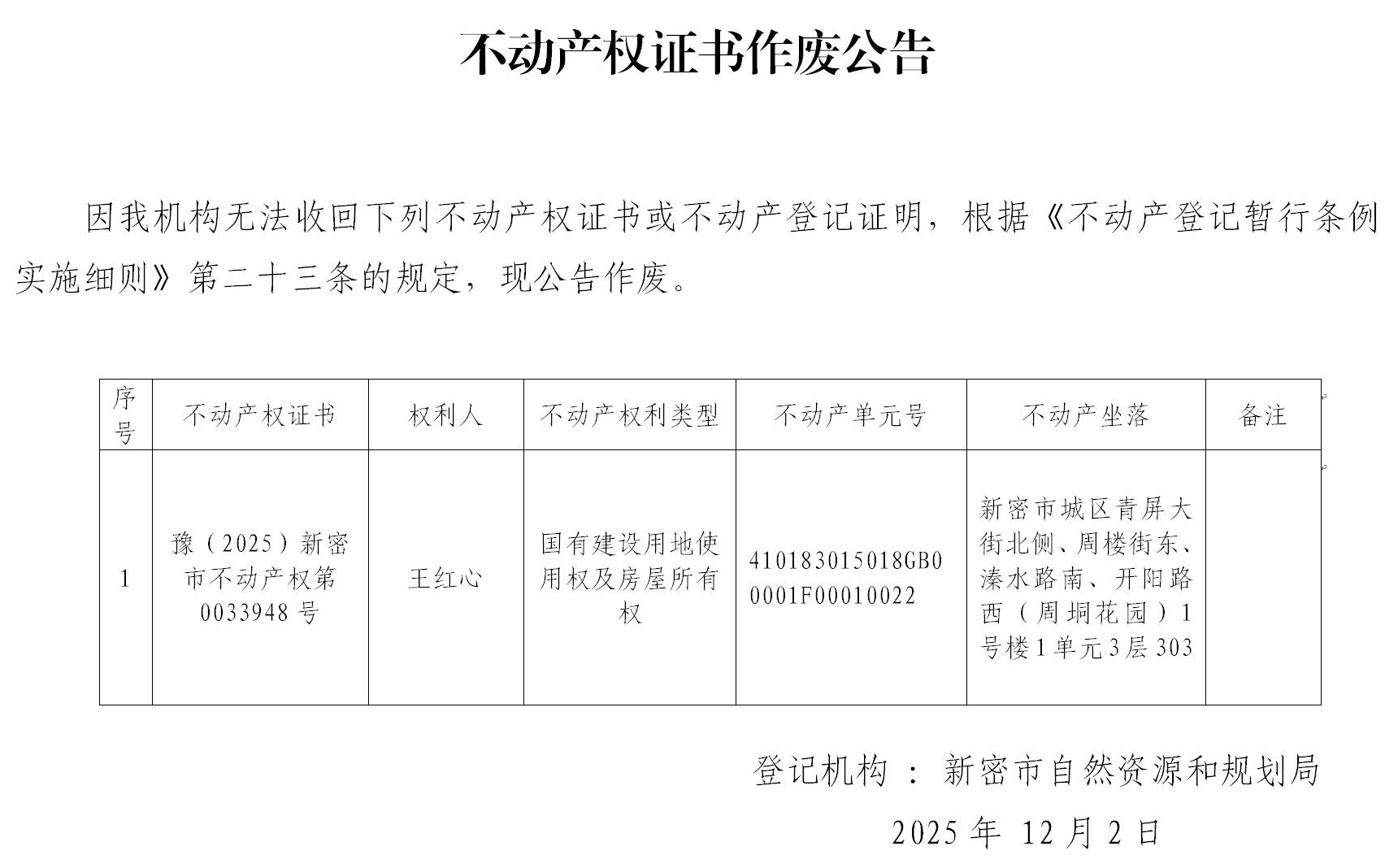关于豫(2025)新密市不动产权第0033948号不动产权证书的作废公告