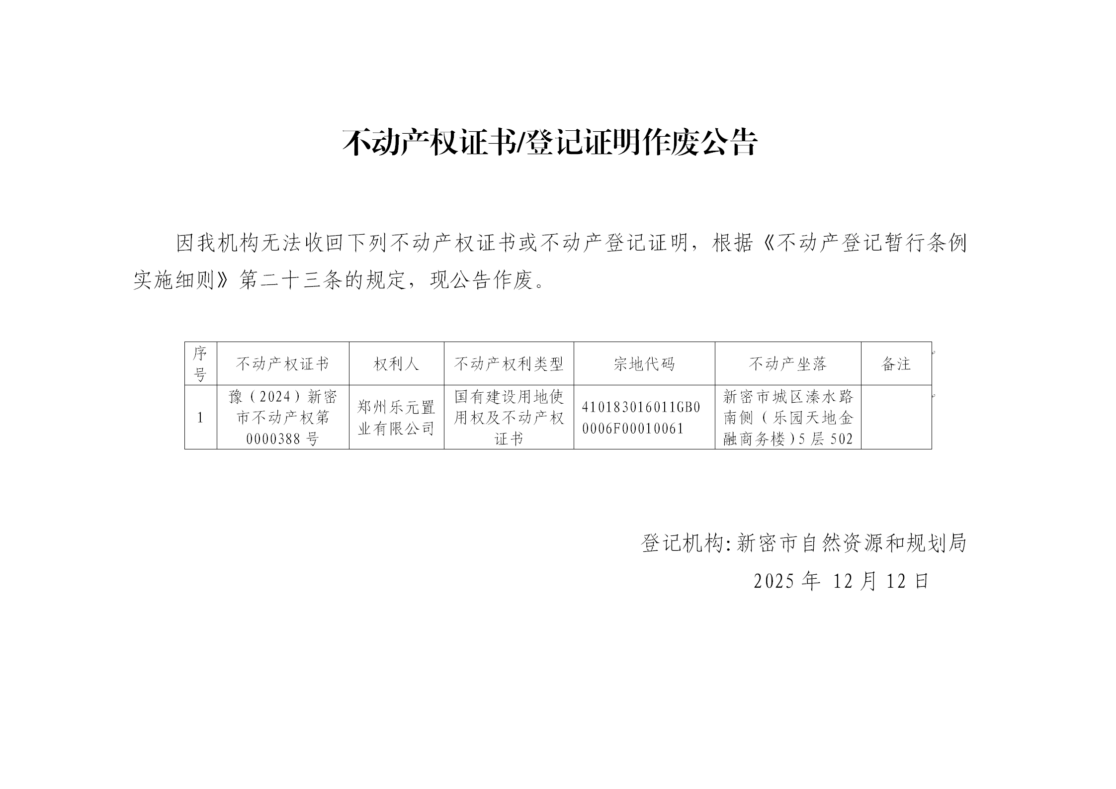 关于豫(2024)新密市不动产权第0000388号不动产权证书作废公告