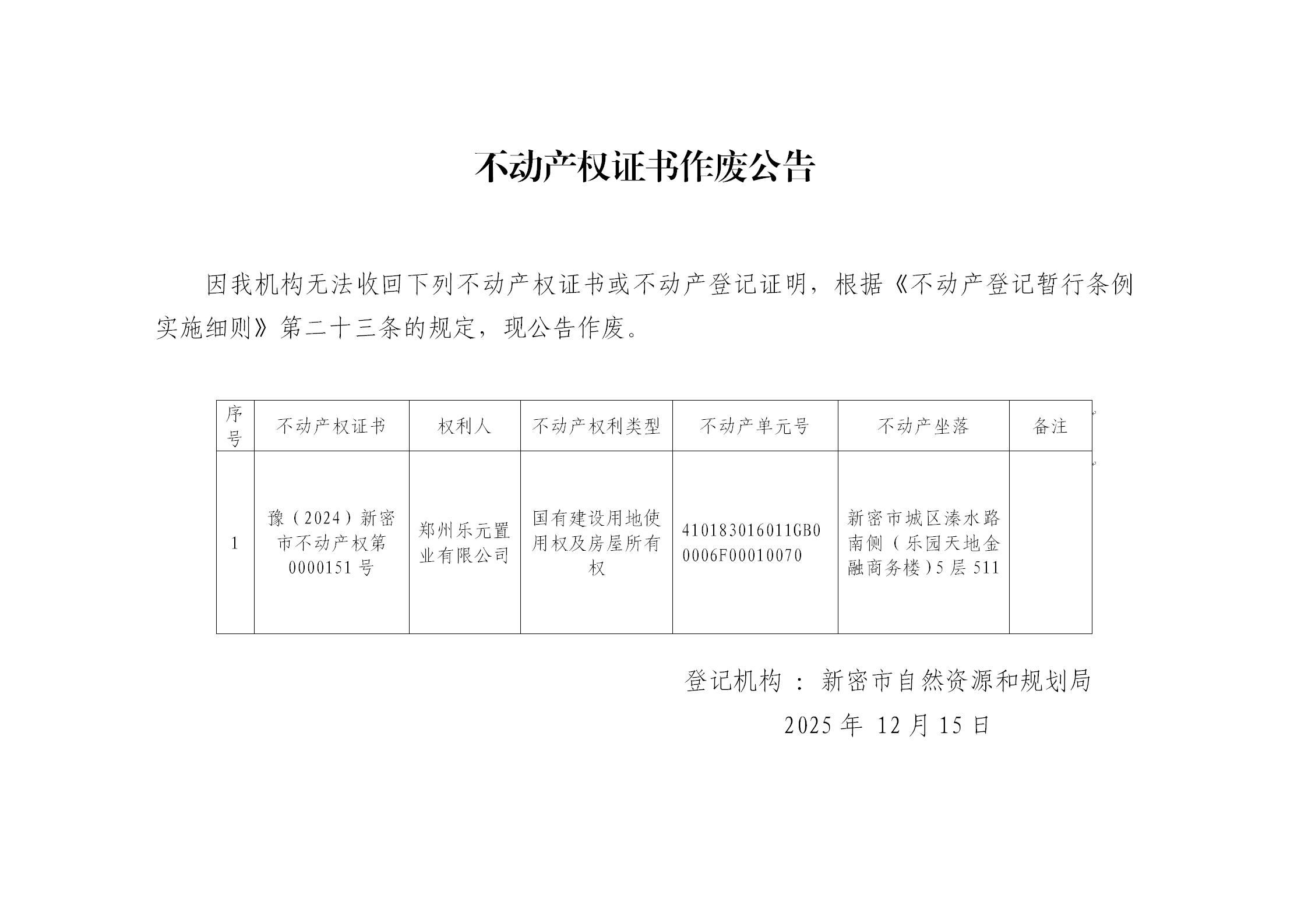 关于豫(2024)新密市不动产权第0000151号不动产权证书作废公告