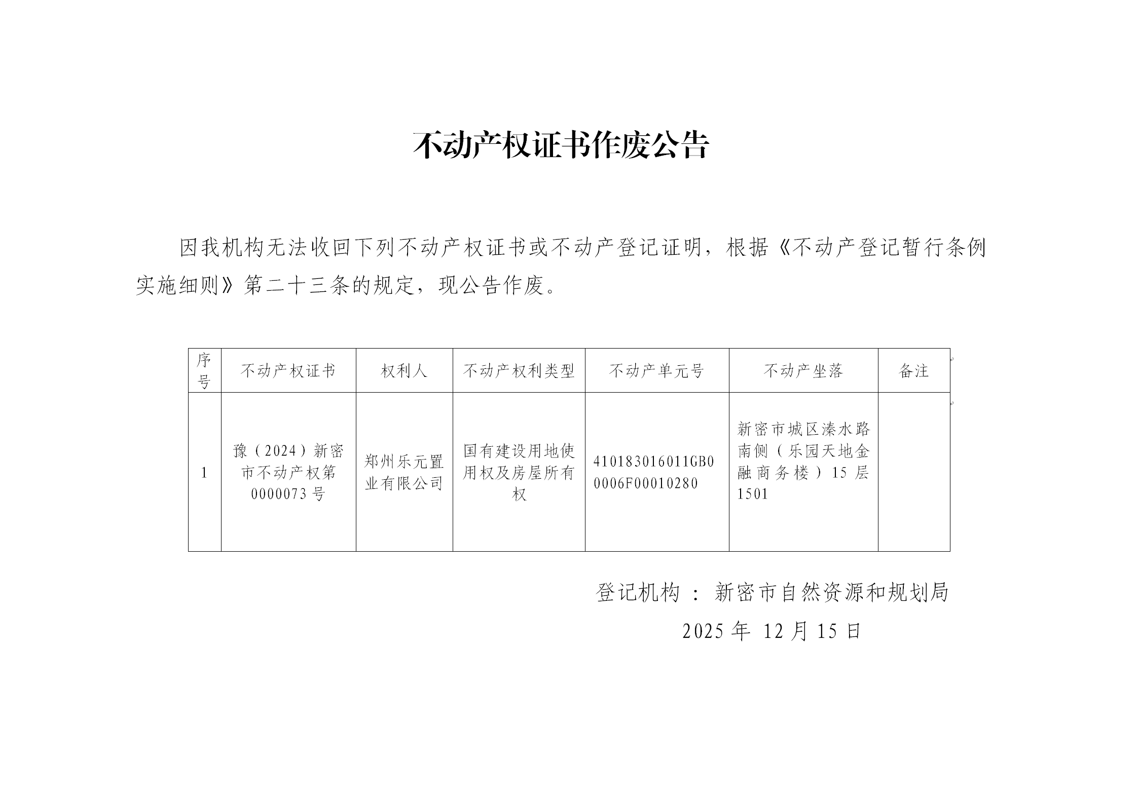 关于豫(2024)新密市不动产权第0000073号不动产权证书作废公告