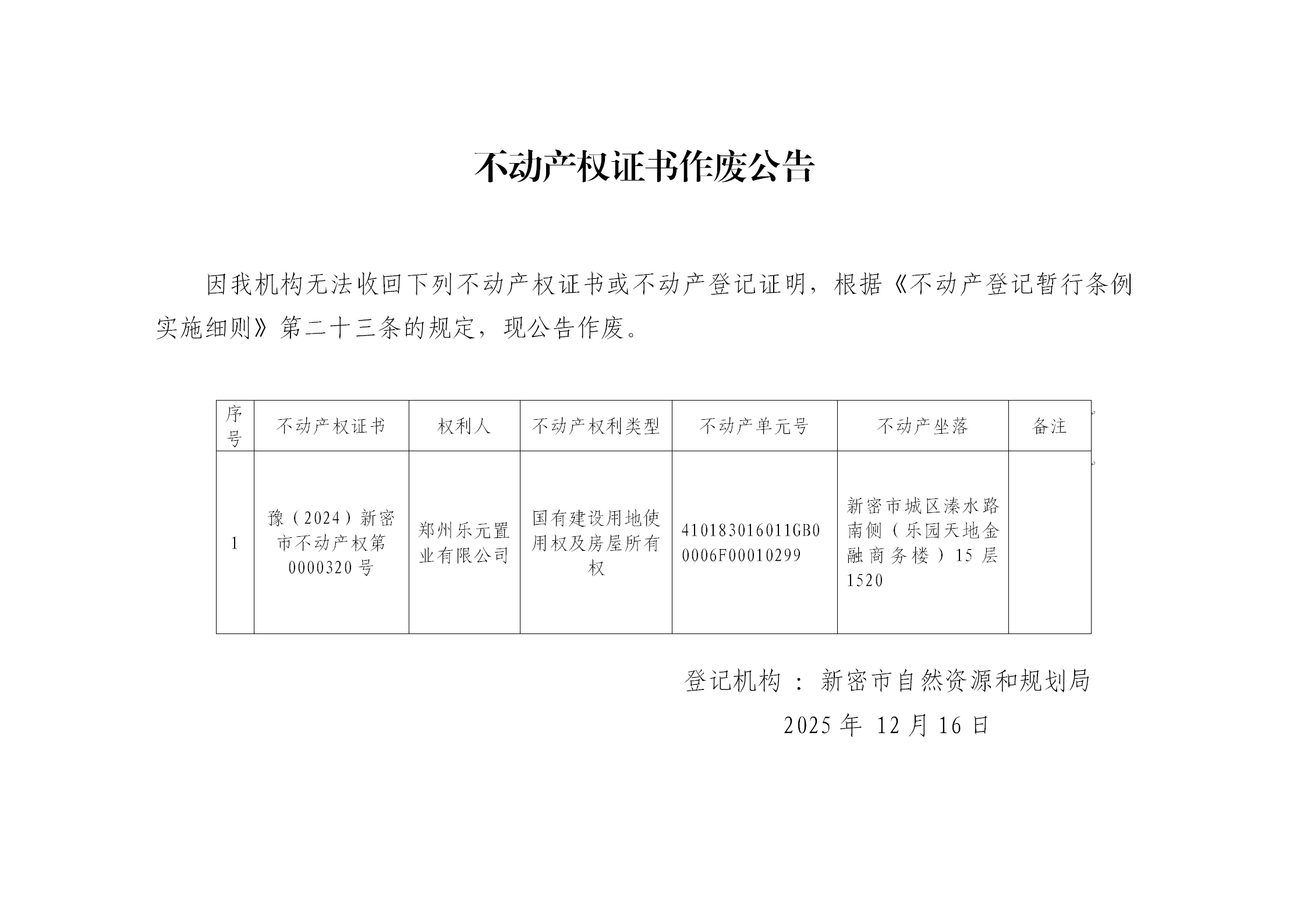 关于豫(2024)新密市不动产权第0000320号不动产权证书作废公告