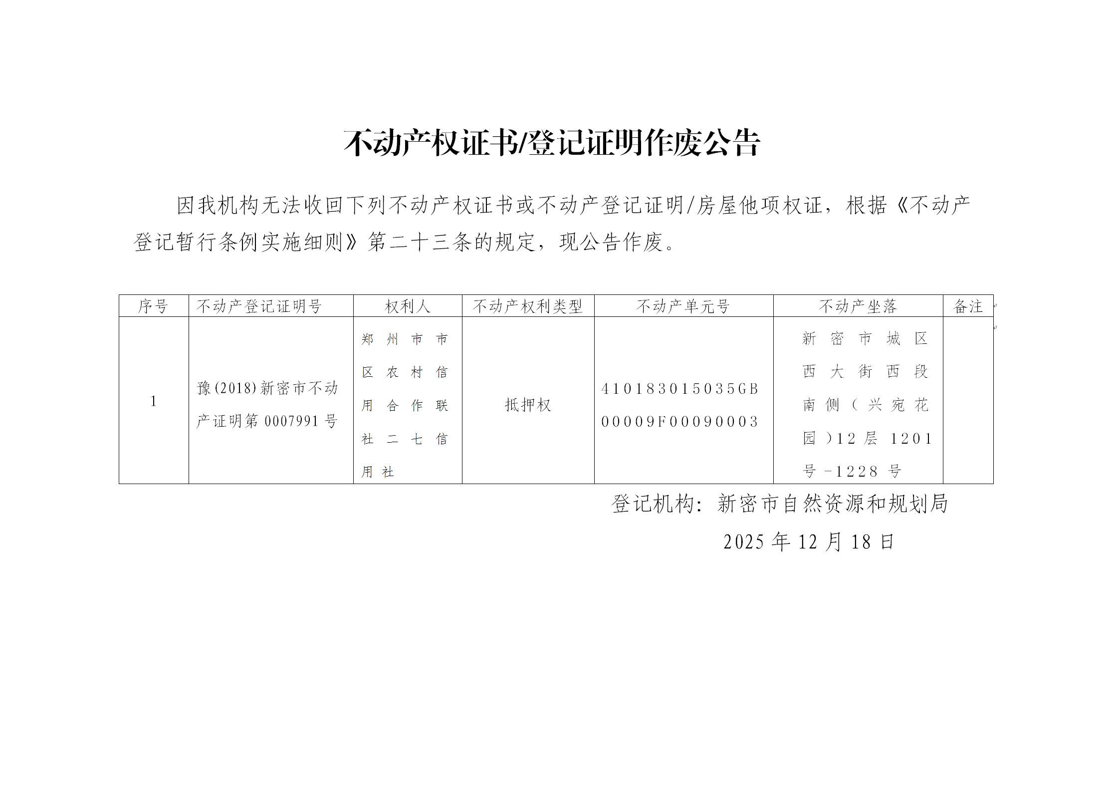 关于豫(2018)新密市不动产证明第0007991号不动产登记证明作废公告