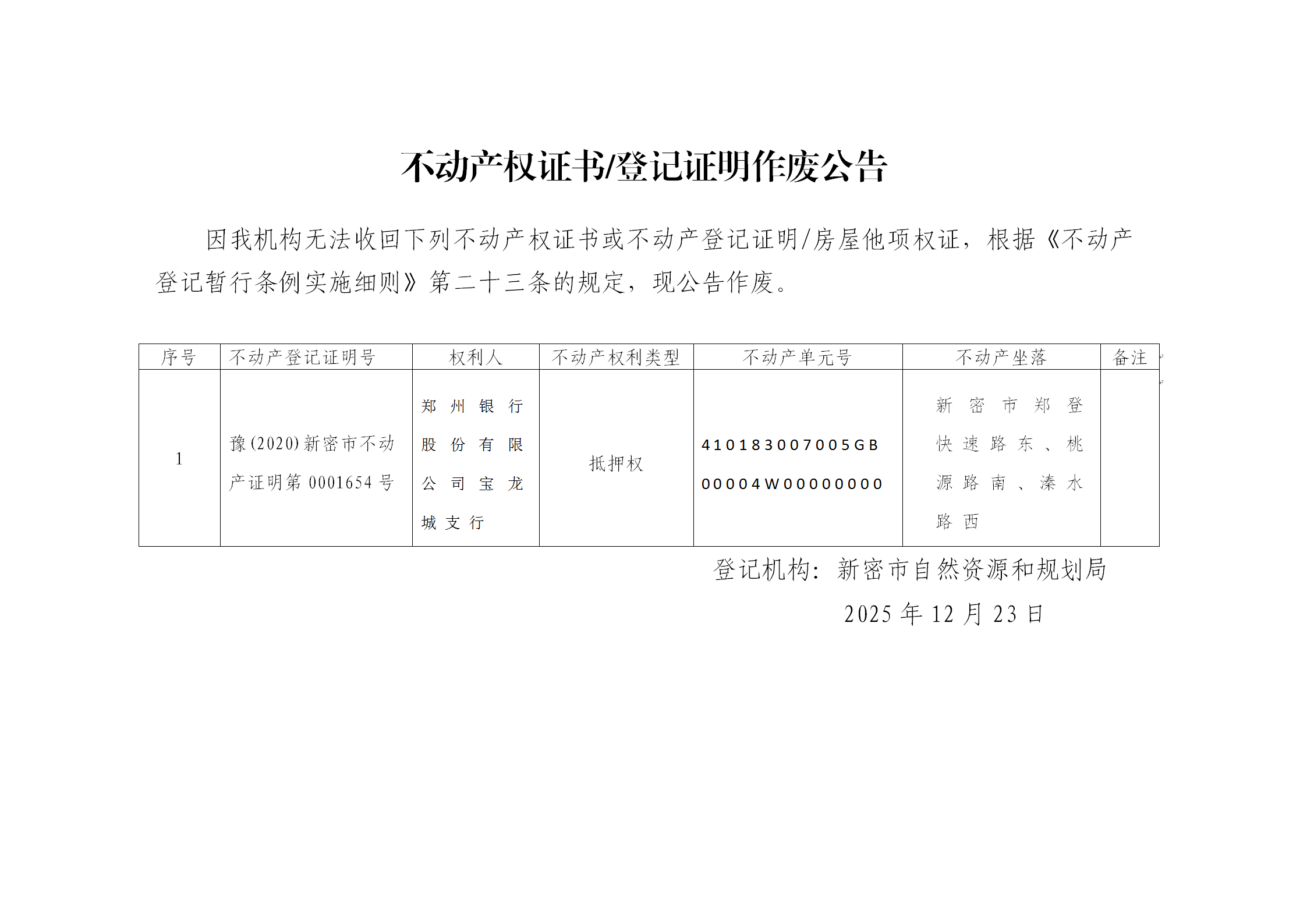 关于豫(2020)新密市不动产证明第0001654号不动产登记证明作废公告