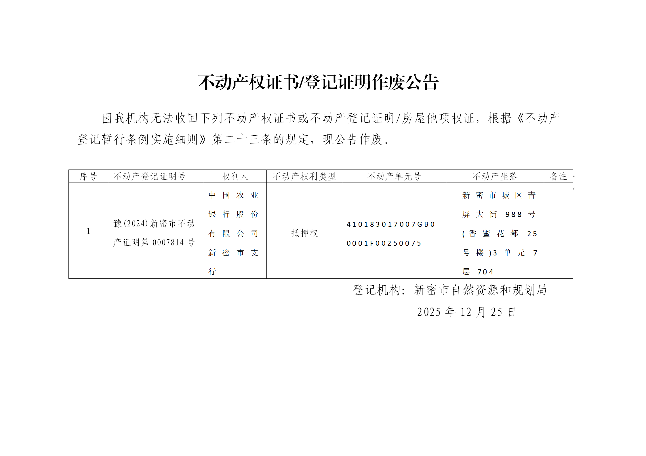 关于豫(2024)新密市不动产证明第0007814号不动产登记证明作废公告
