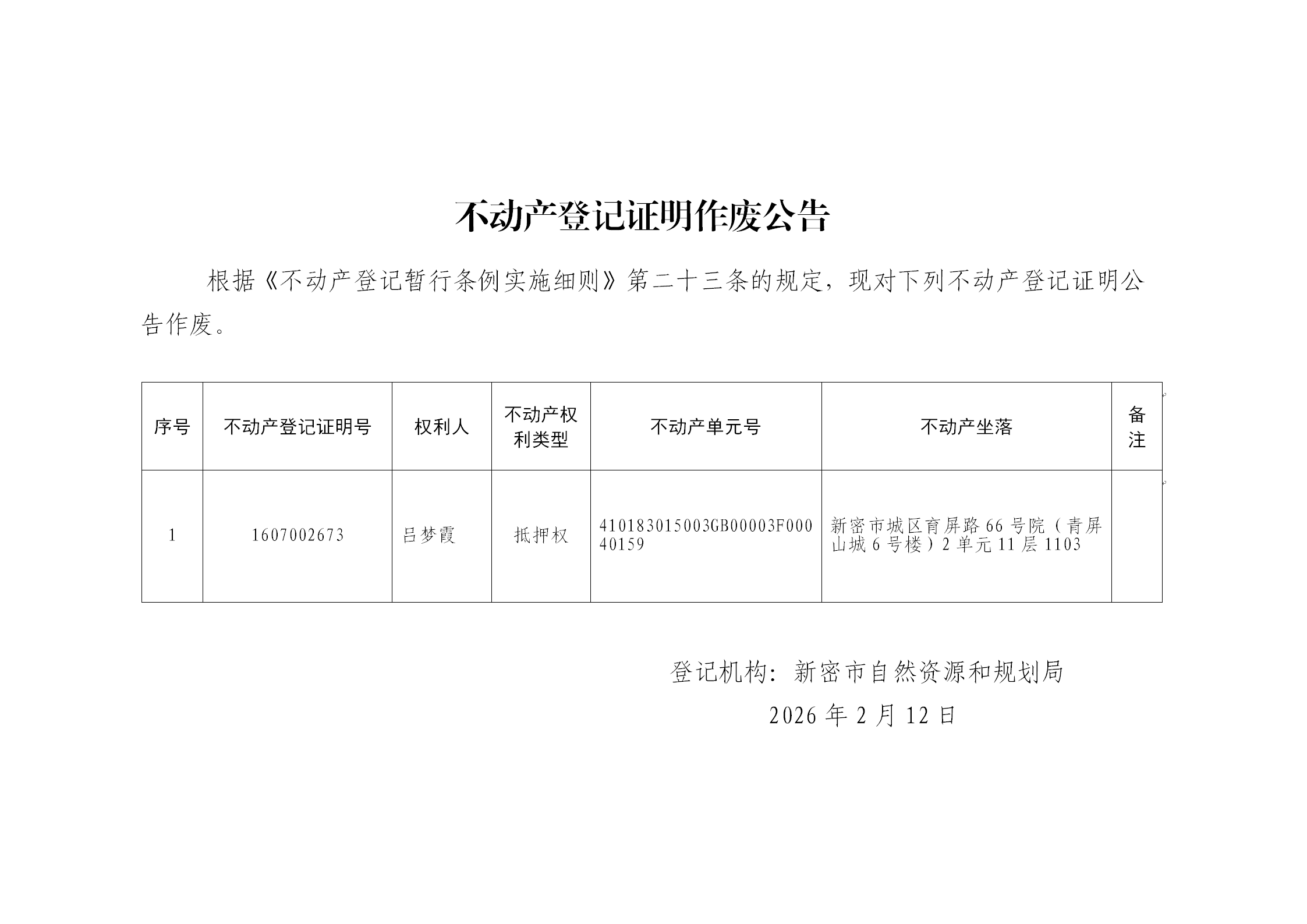 关于1607002673号不动产登记证明作废公告