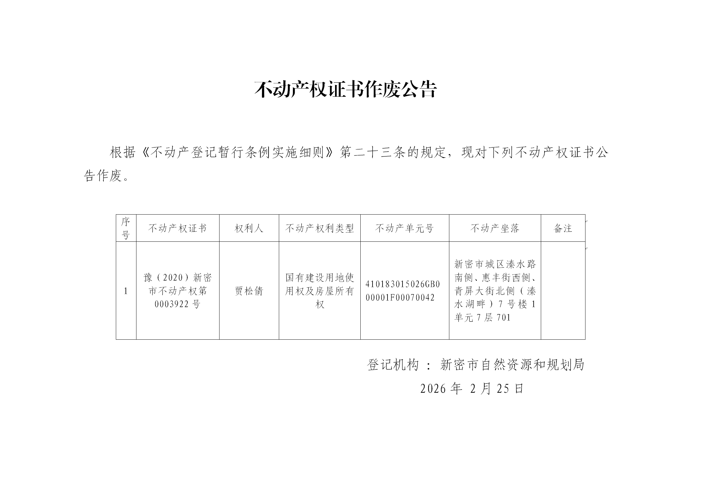 关于豫(2020)新密市不动产权第0003922号不动产权证书作废公告