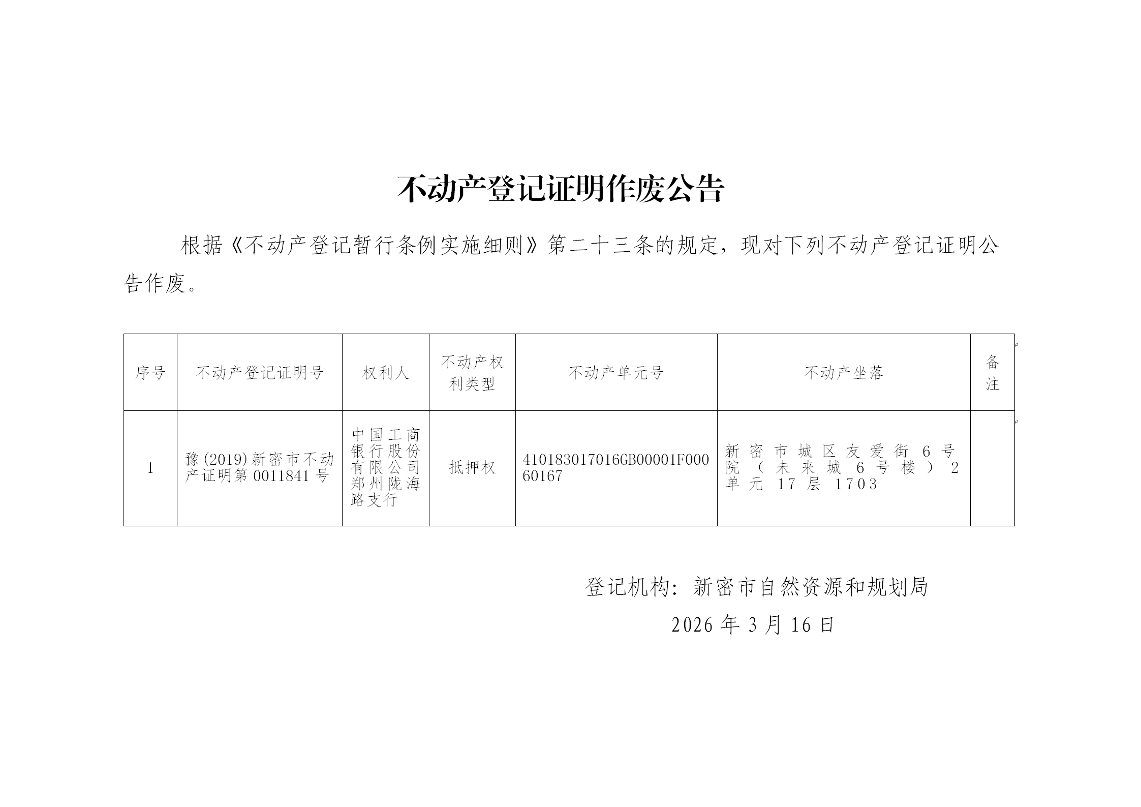 关于豫(2019)新密市不动产证明第0011841号不动产登记证明作废公告